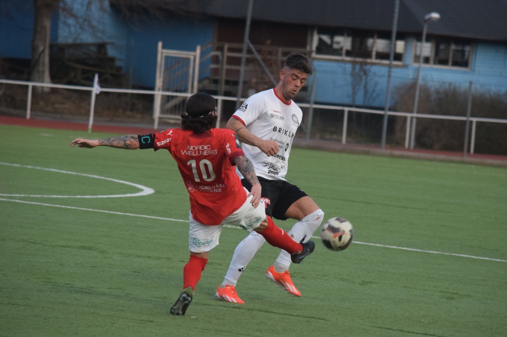 Martin Cruz Aliaga petar undan bollen precis framför Sindre Sakshaug