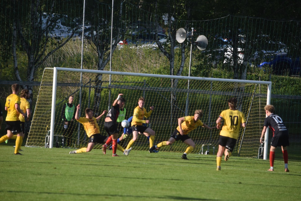 Sindre Sakshaug har tagit sig in till bra skottläge men bollen prickar en försvarare och vidare till en hörna