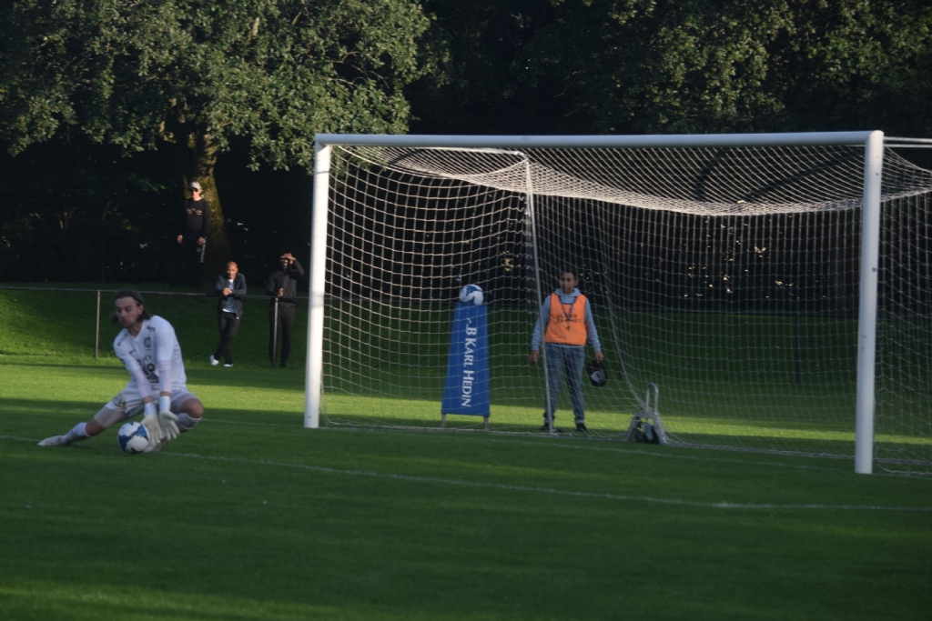 Mattias Jansson klarar Eliyo Türkan skott. Det blir retur men Mattias är snabbt uppe och lägger beslag på bollen