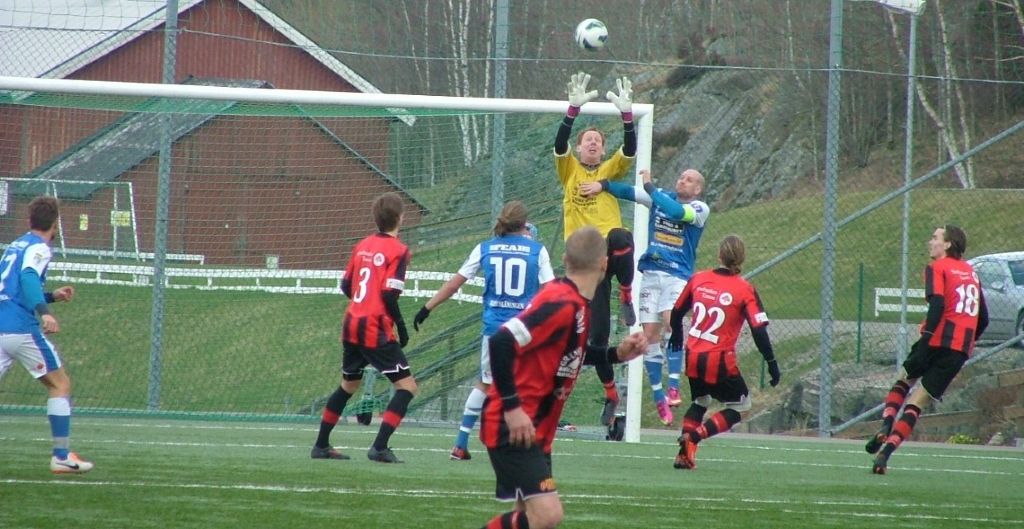 Martin Hansson i Grebbestads mål kommer ut fint och plockar ner bollen.