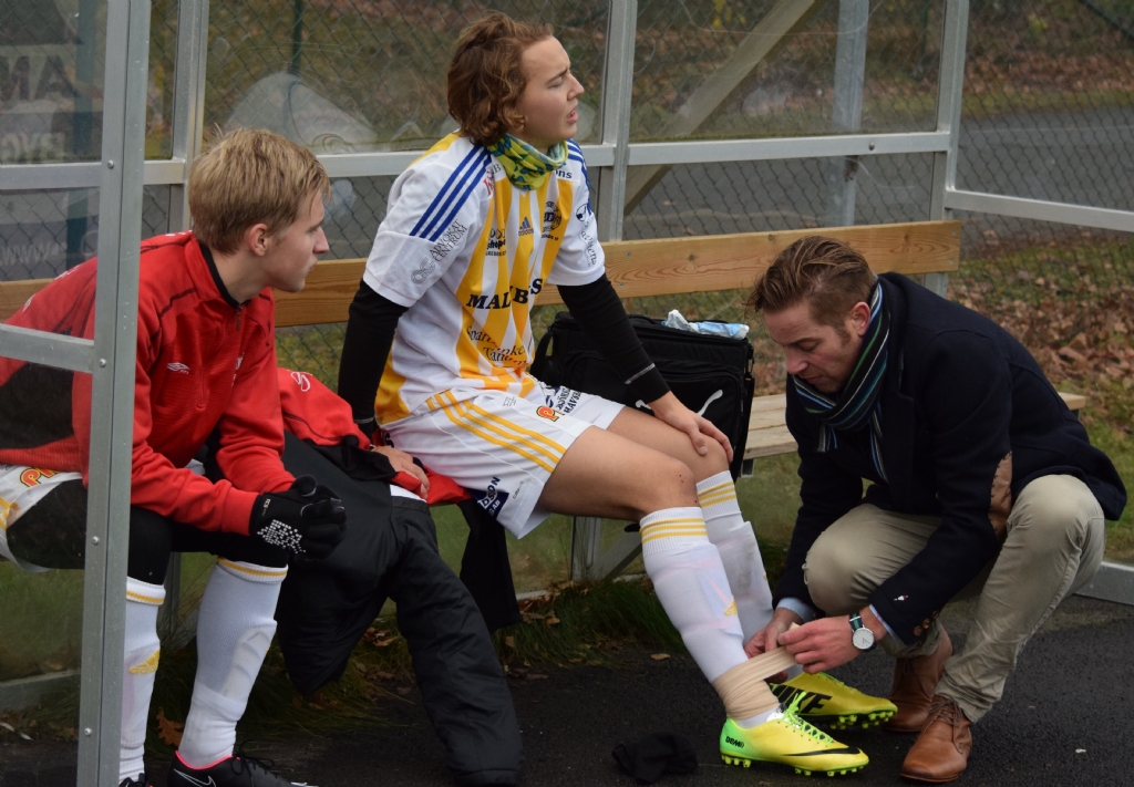 Joshua Öster hann bara vara på planen i 1 minut innan han åkte på en tackling och fick bryta matchen. Mikael Albrektsson bandagerar. På bänken här ser vi även Jonathan Jonsson (Svarteborg).