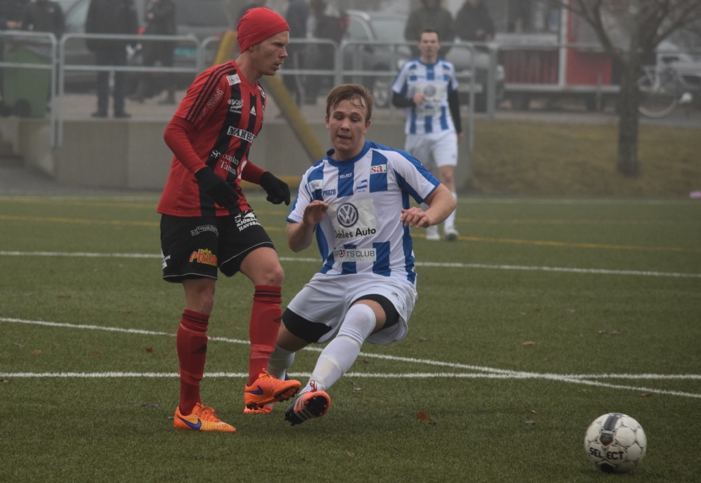 Markus Svensson passar bollen vidare precis före Sarpsborgsspelaren kommer