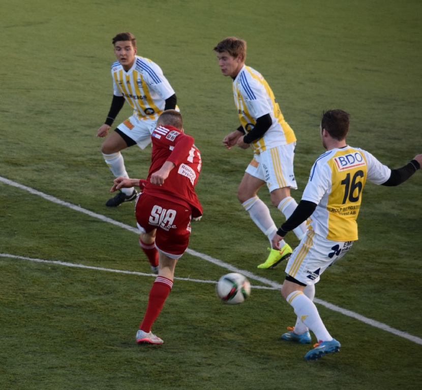 Viktor Granat skjuter bra men över. Edon Qeriqi, Ulrik Karnström och Jimmie Larsson alla i närheten för att störa