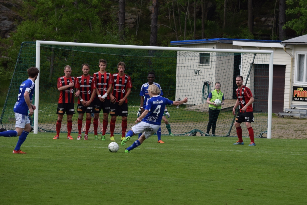 Oskar Alvers skjuter mot Grebbestadsmålet på en frispark strax utanför 16-metaren