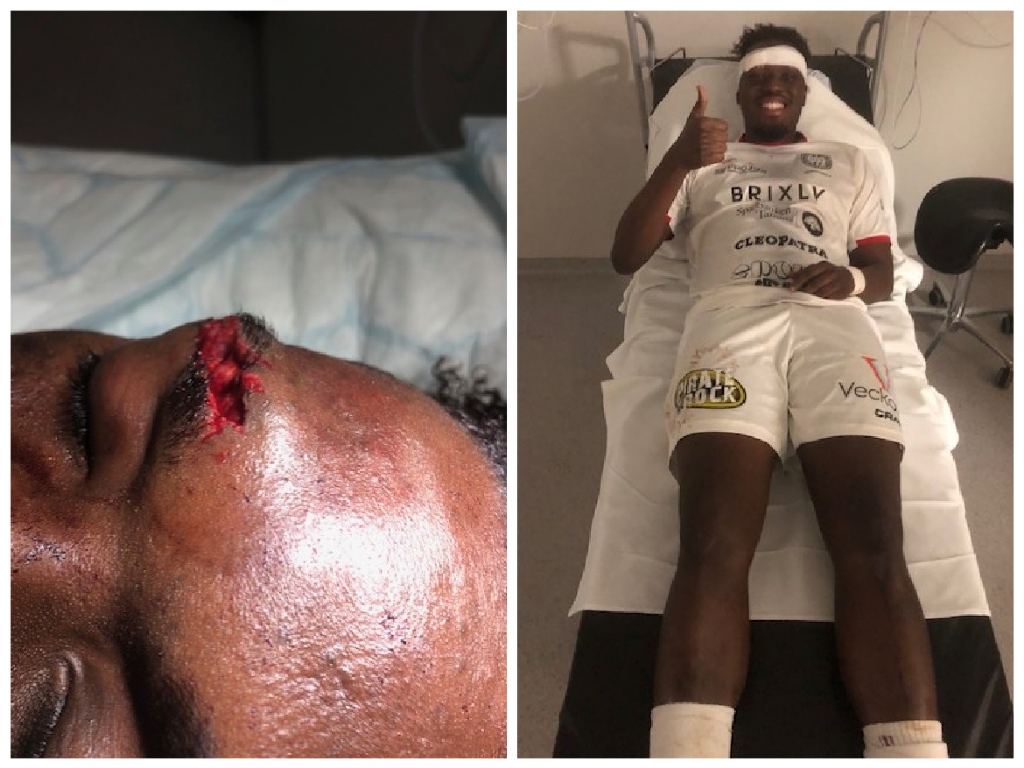 Otrevliga scener på Framnäs i Lidköping i fredags. Mark Kwarteng och hemmalagets Gabrijel Matanovic som båda blev liggandes länge och plåstrades om. Nu vet vi i alla fall att Mark mår bra.